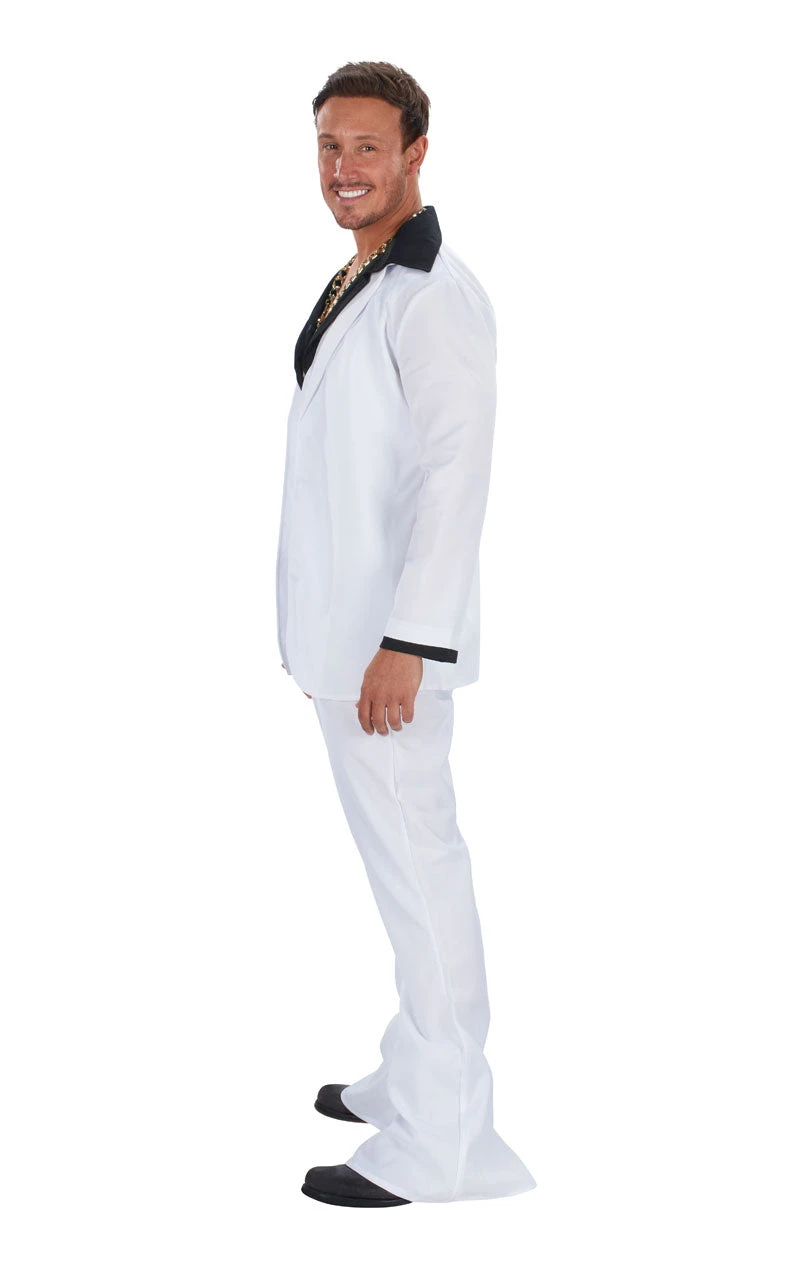 The Adult 1970s White Suit Costume is made up of a white suit jacket with an attached black shirt and a pair of matching white flared trousers. Why not add a big wig and some gold chains to achieve ultimate 70’s style?