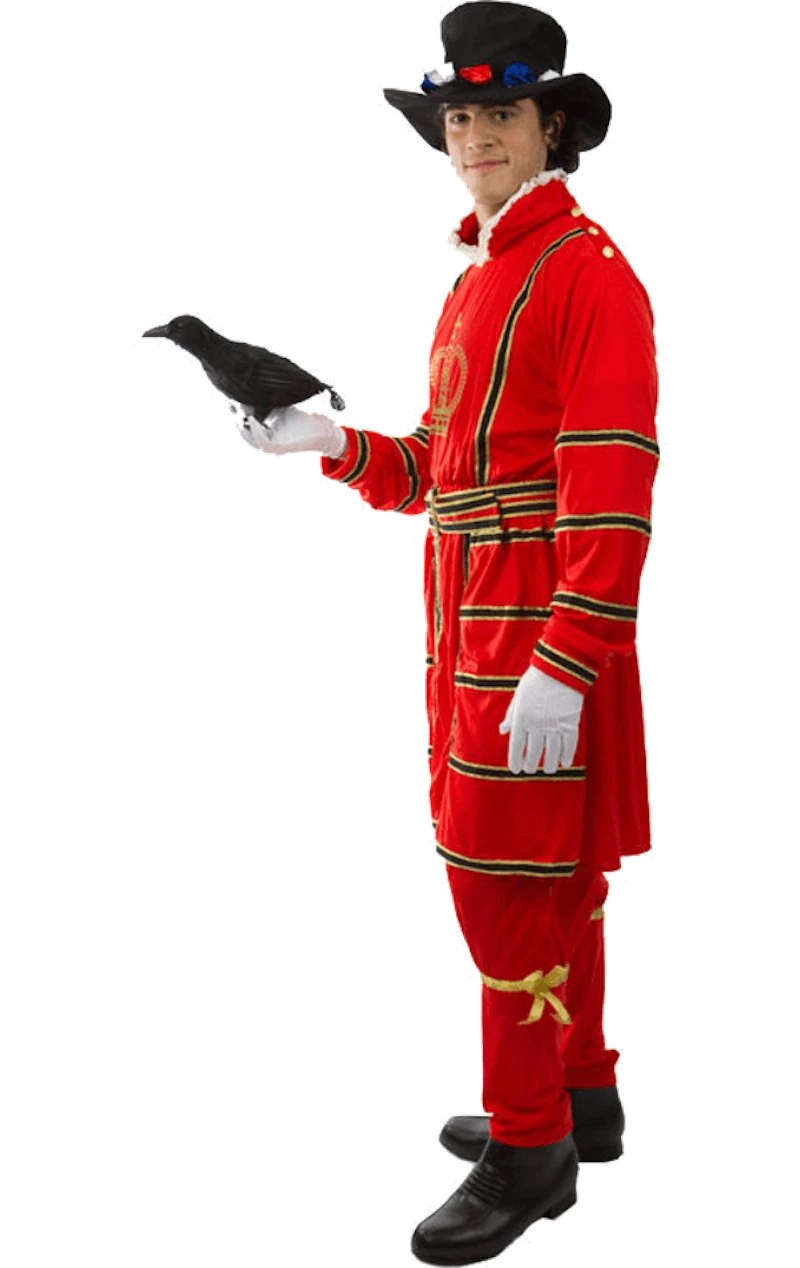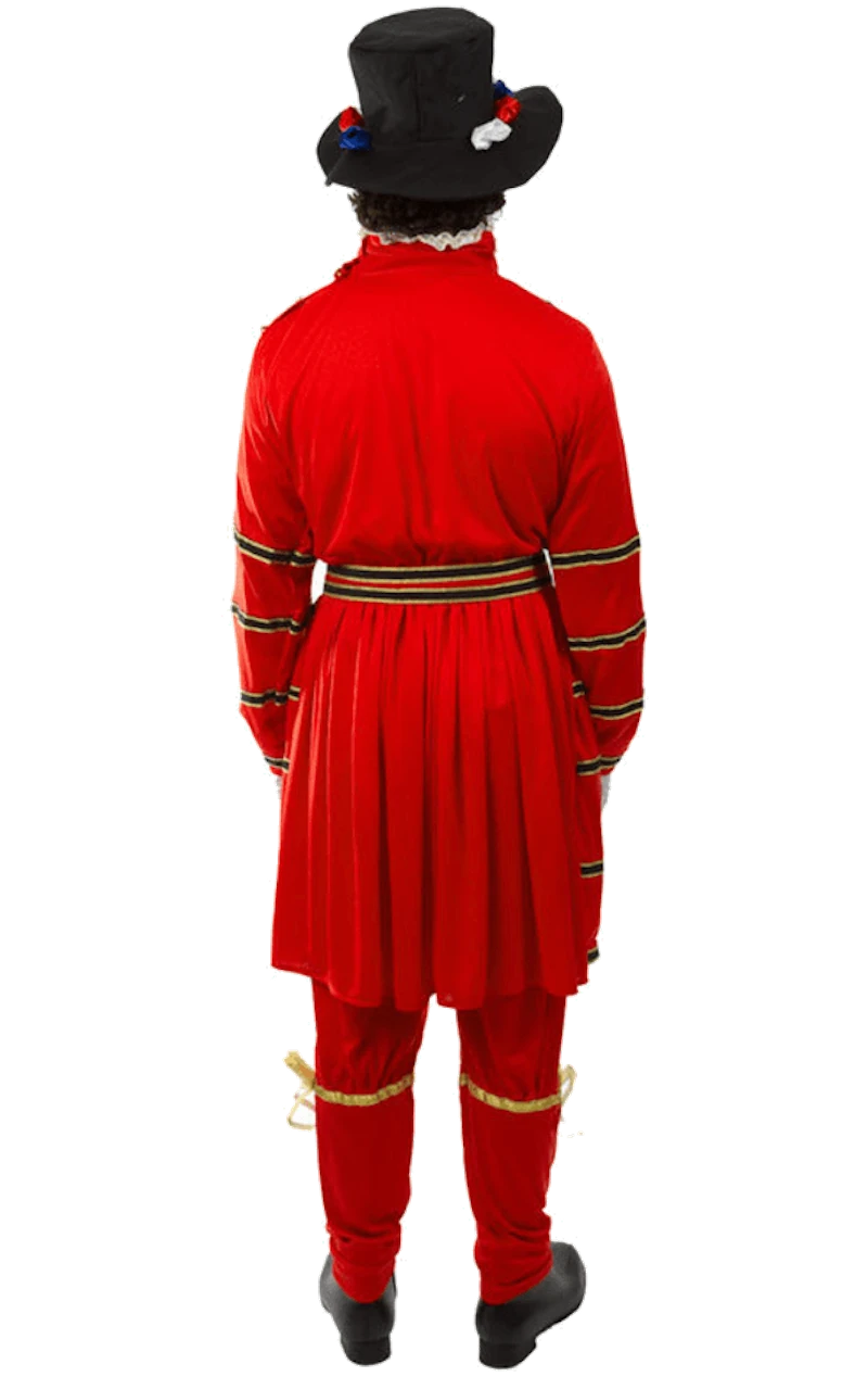 The Adult Beefeater Costume is made up of a long-sleeved red top with a ruffled white collar and gold crown illustration on the front, with plenty of black and gold striped detailing. It also includes a pair of matching red trousers and a classic black hat to give you the ultimate Beefeater look.