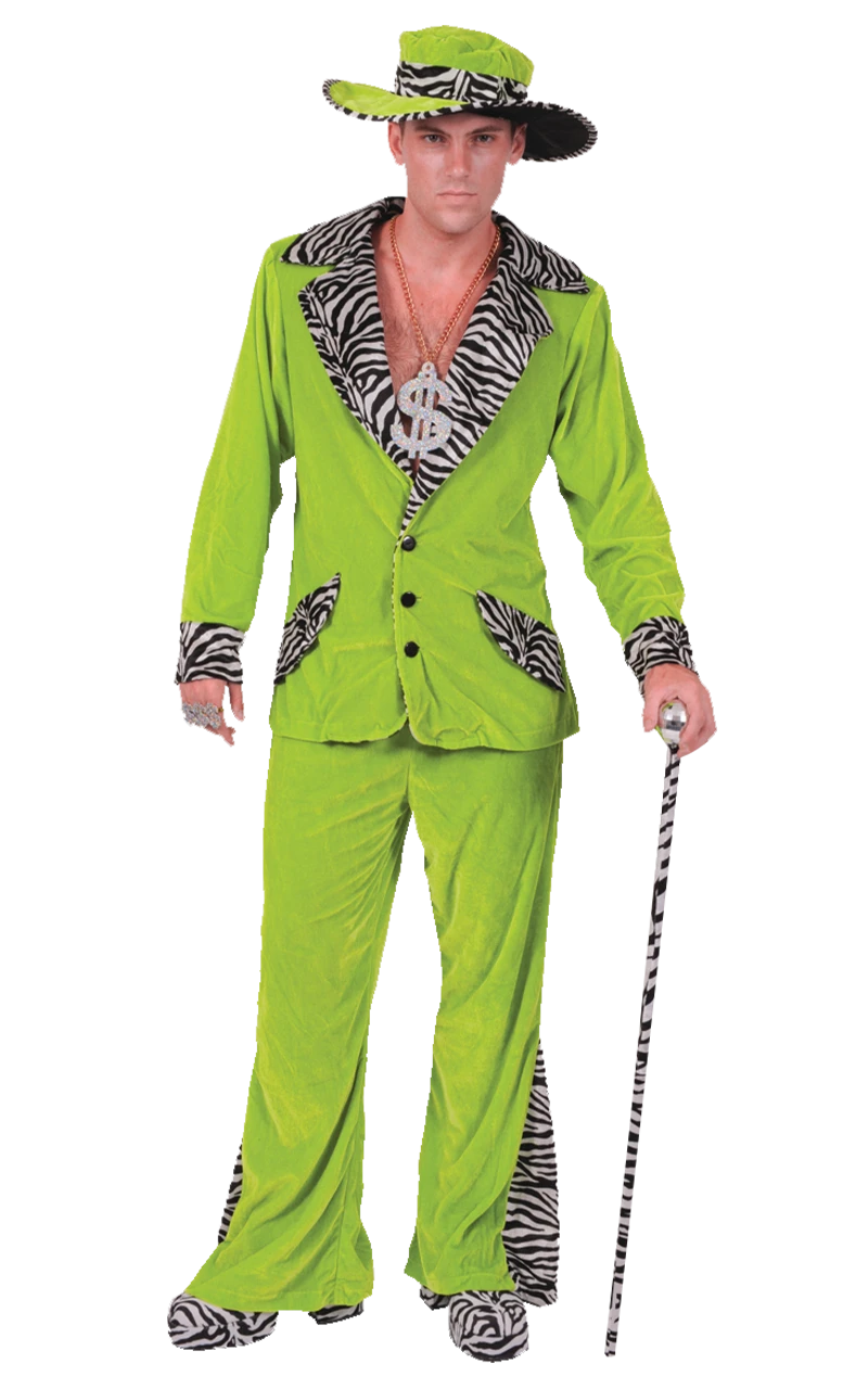 The Adult Green Pimp Costume is made up of a vibrant green, velvet-like suit jacket, with a pair of matching trousers. The jacket features zebra print detailing on the collar, pockets and sleeves, as well as down the sides of the trousers, creating a bold, statement look. Completing the look is a matching green and zebra print hat. Add a classic pimp cane and you’ll be demanding respect on the dancefloor!