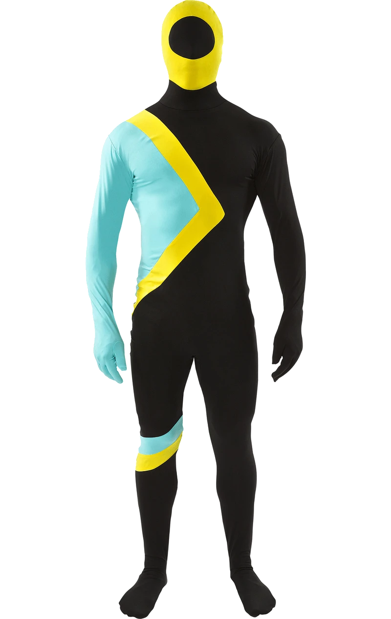 The Adult Jamaican Bobsled Suit is made up of a skinsuit that features an over-the-face attached hood, which unzips from the back so you can eat and drink while wearing it. The costume has a brightly coloured design that represents the Jamaican flag, with the green, yellow, and black colours.