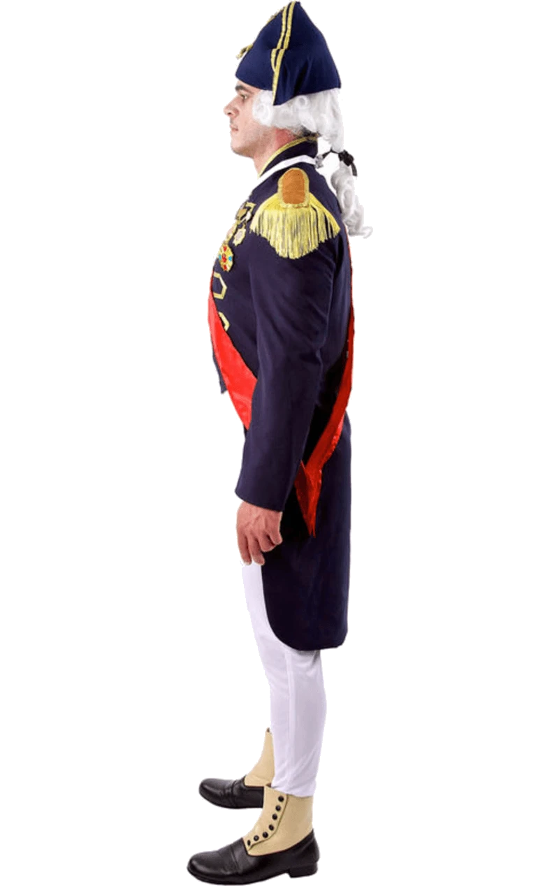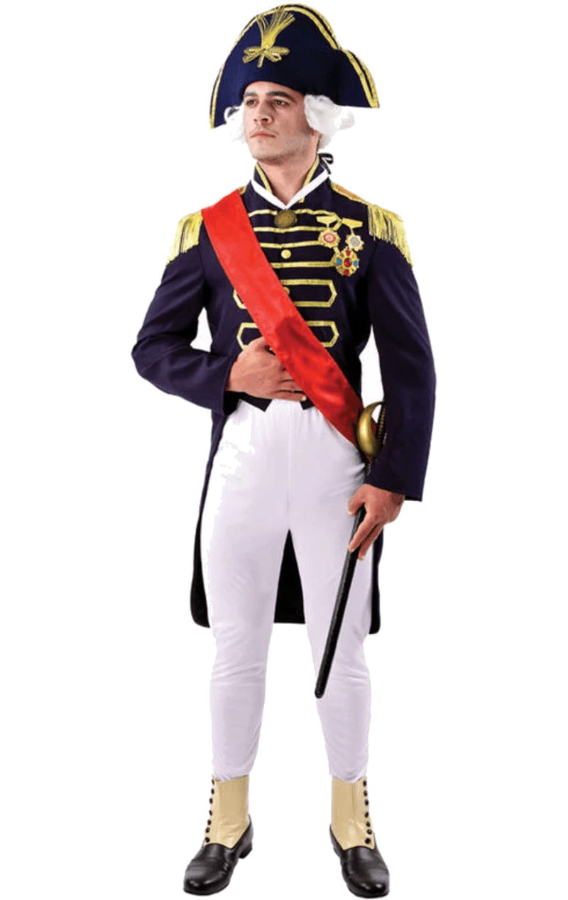 The Adult Lord Nelson Costume is made up of a navy smart jacket with a long tail at the back. It features intricate gold detailing, with medals across the chest and gold epaulettes. The costume also includes a pair of white trousers, a red sash and a navy and gold hat with white hair attached.