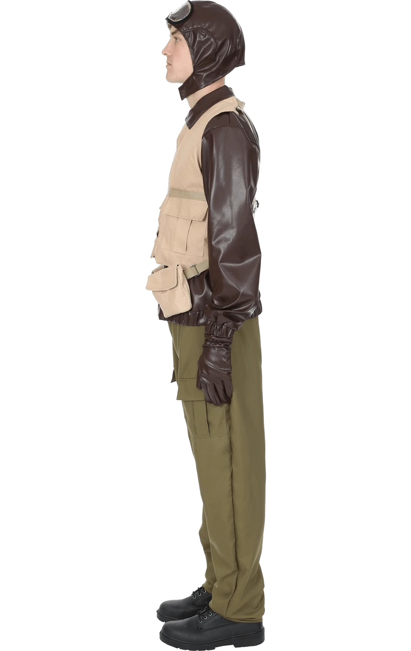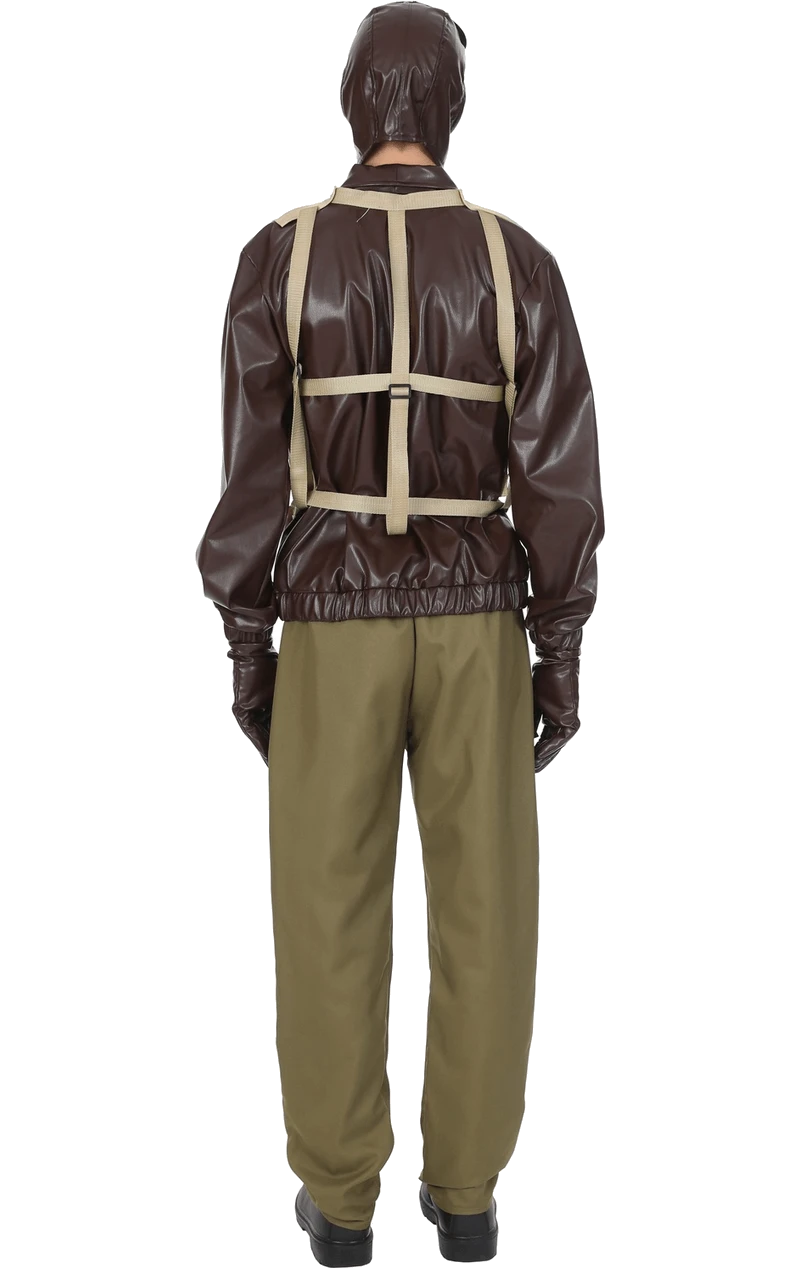 The Adult Mens WW2 Pilot Costume includes a leather-look dark brown jacket with an attached beige harness, which features adjustable straps around the middle. The costume also includes a pair of matching beige trousers, dark brown gloves and a headpiece with attached goggles.