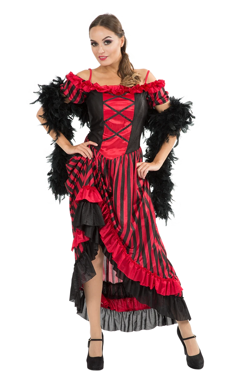 The Adult Saloon Girl Costume is made up of red and black dress with stripe and cross patterns. It’s then trimmed with fabulous frills. It also features an asymmetrical style to expose the right leg, for a sultry touch to the costume. This also helps with moving around the dancefloor, giving you the freedom to perform the perfect ‘Can Can’.