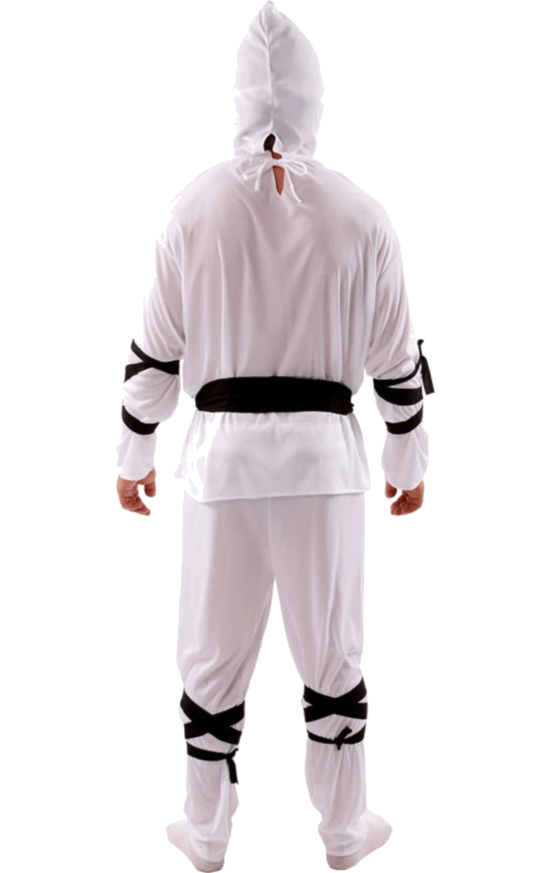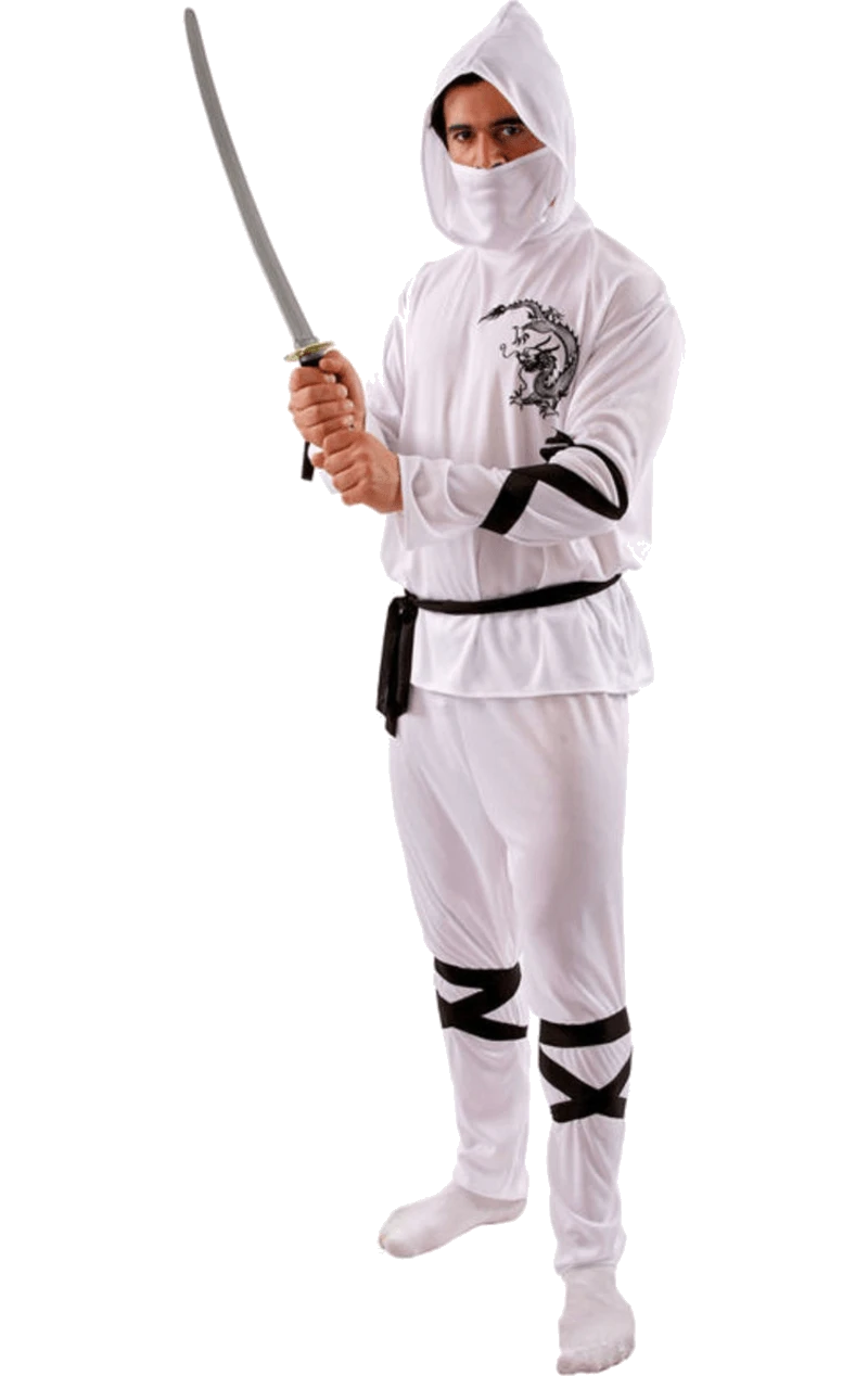 The White Ninja Costume is made up of a white long-sleeved top with intricate detailing of a dragon on the chest. It also includes a matching pair of white trousers. Completing your ninja outfit are black arm and leg ties and a white headpiece.