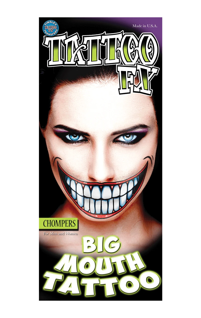 Do you have a nickname of big mouth? Chatter box? Motor mouth? If you do or even if you don’t, this Chompers Big Mouth Tattoo is a funny accessory for Halloween which will have people smiling and recoiling at the same time! Get yourself the ultimate in tattoo transfers and freak people out in no time! SMILE!