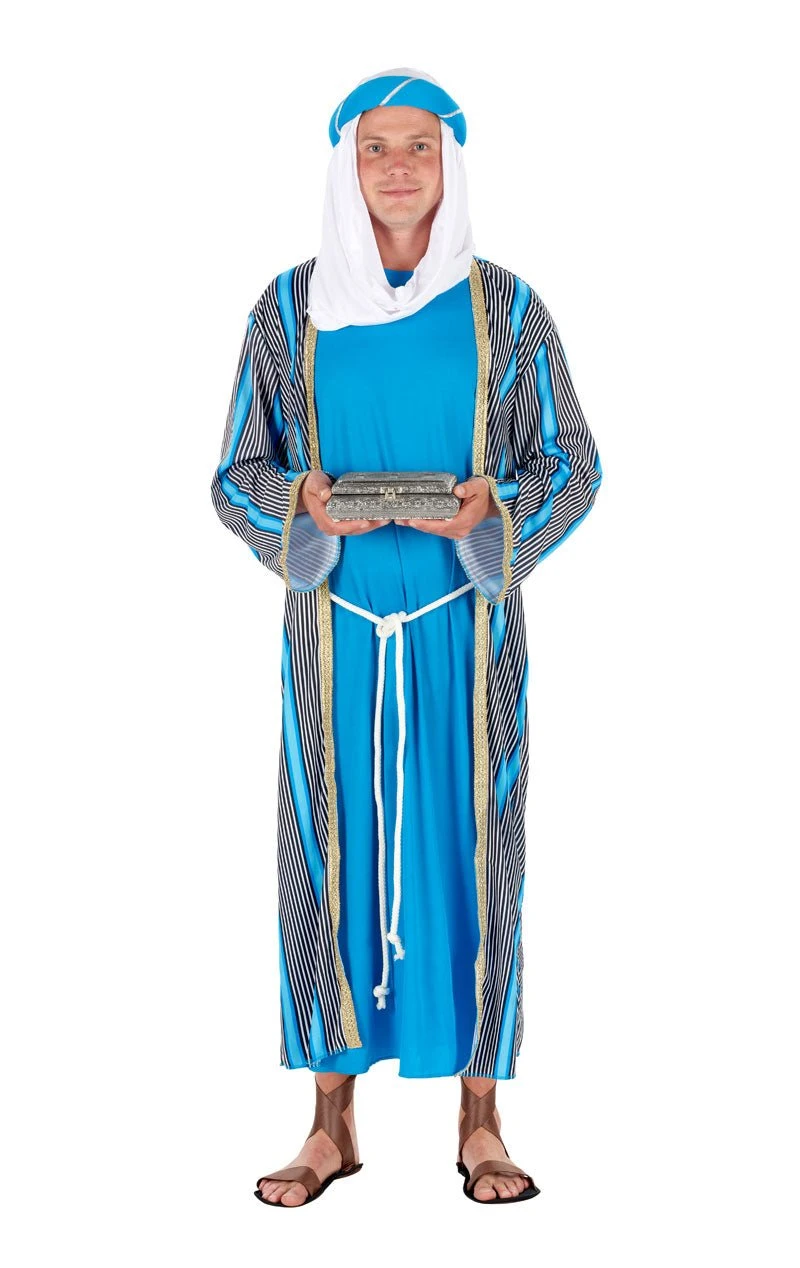 The Adult Three Wise Men Blue Costume comes complete with an all-in-one bright blue caftan with a white rope belt. It also features an attached jacket featuring black and white stripes, with gold and blue detailing on the sleeves. To complete the look, put on our flowing white headpiece with a blue band. You have everything you need to transform into one of the Three Wise Men!