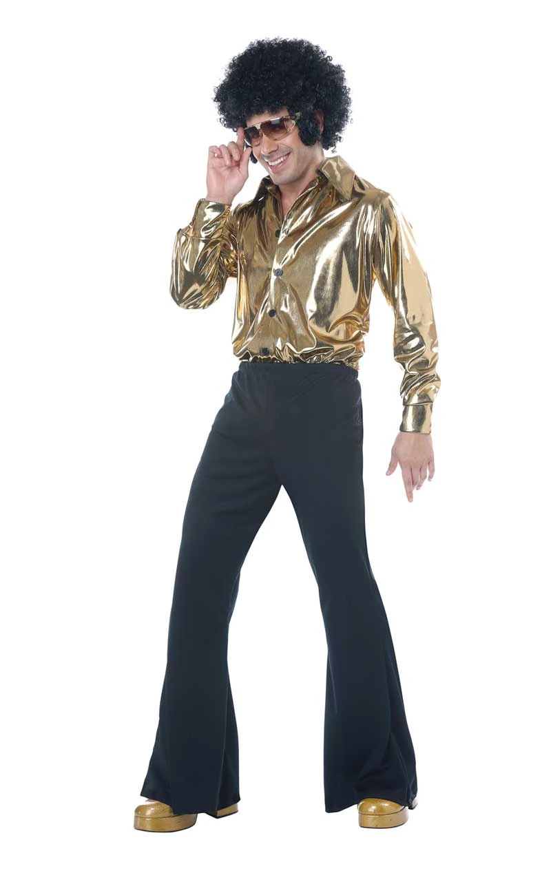 The Mens Disco King Costume comes complete with a vibrant and shiny gold shirt with black button-front detailing. It can either be fastened up to the top, or leave a few buttons undone if you want to reveal a bit of chest hair. Also included is a pair of tight black flared trousers to create that true Elvis look. Why not add a pair of gold sunglasses and a black afro wig to transform yourself into a true disco dude?