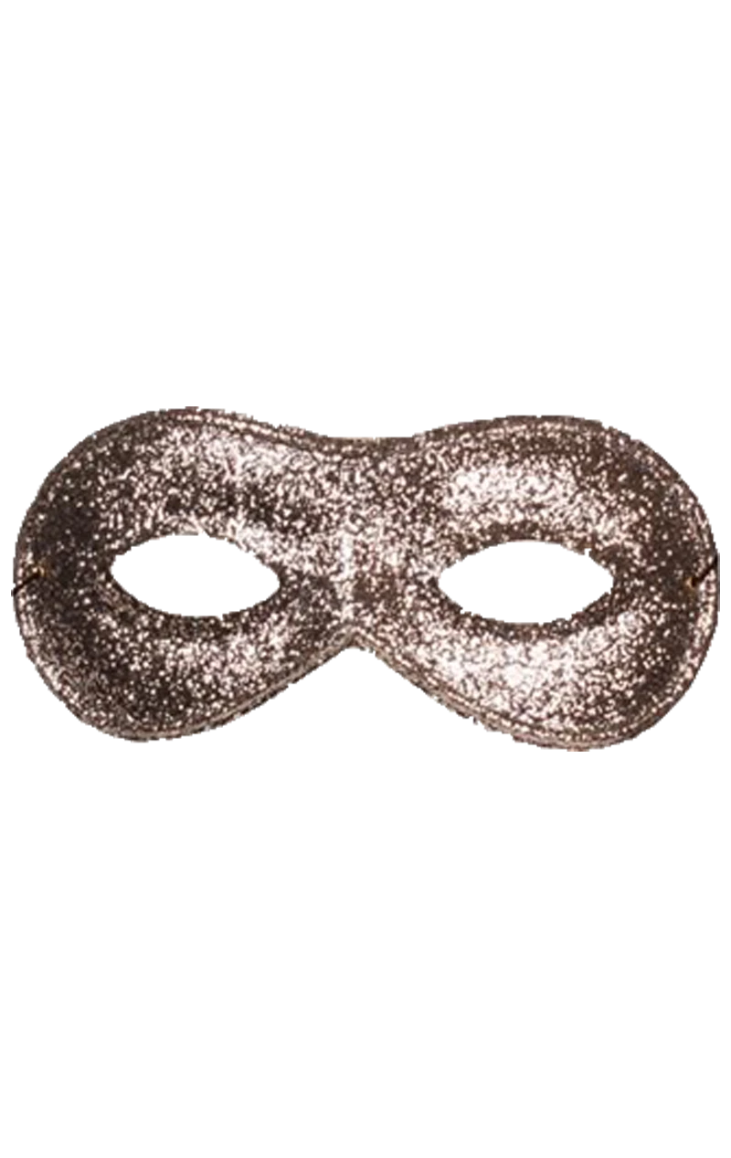 Small Silver glittery domino facepiece.Secures by loop of elastic. Width across the back of the facepiece is approximately 17cm.