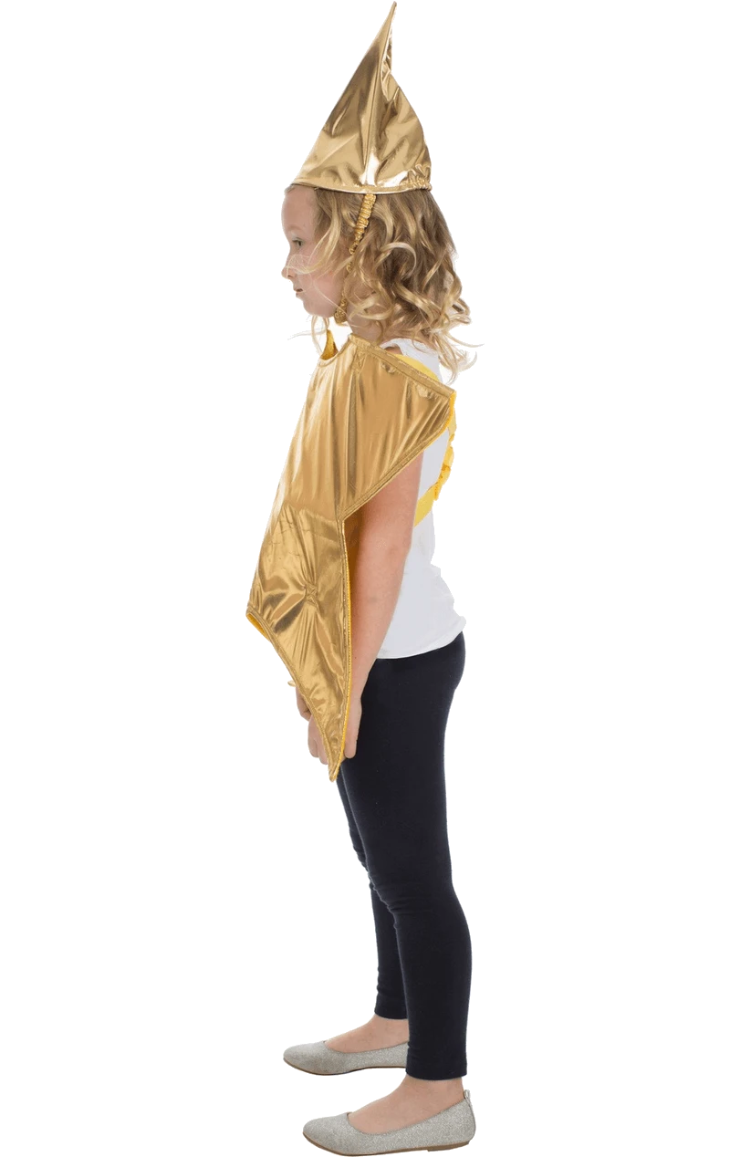 The Kid’s Gold Star Christmas Costume is made up of sparkling star shaped tunic that slides over the head. A gold hat then completes the point of the star.