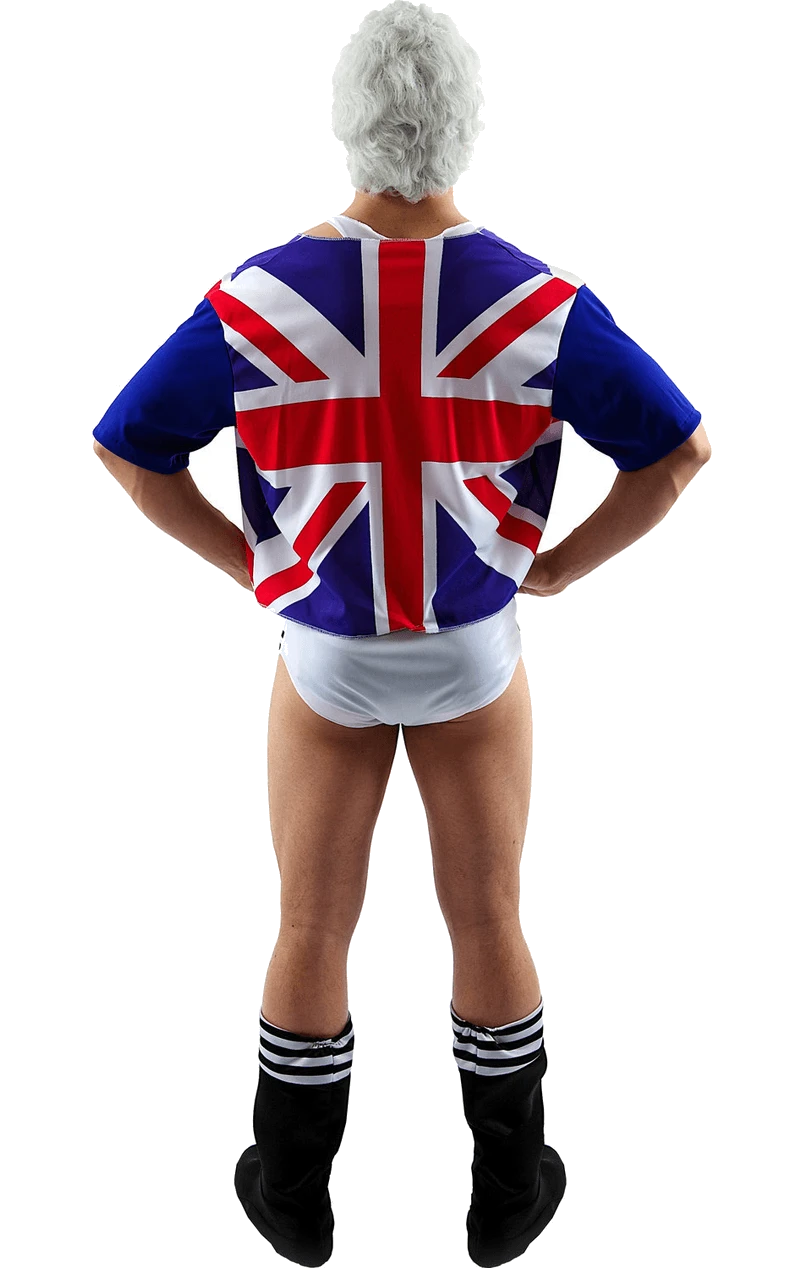 The Mens Big Daddy Wrestler Costume includes a white, sleeveless, all-in-one bodysuit, with the words ‘Big Daddy’ printed in black across the front. The costume also features a Union Jack throw on piece for over the shoulders, a platinum blonde wig and a pair of black boot covers with white stripes.