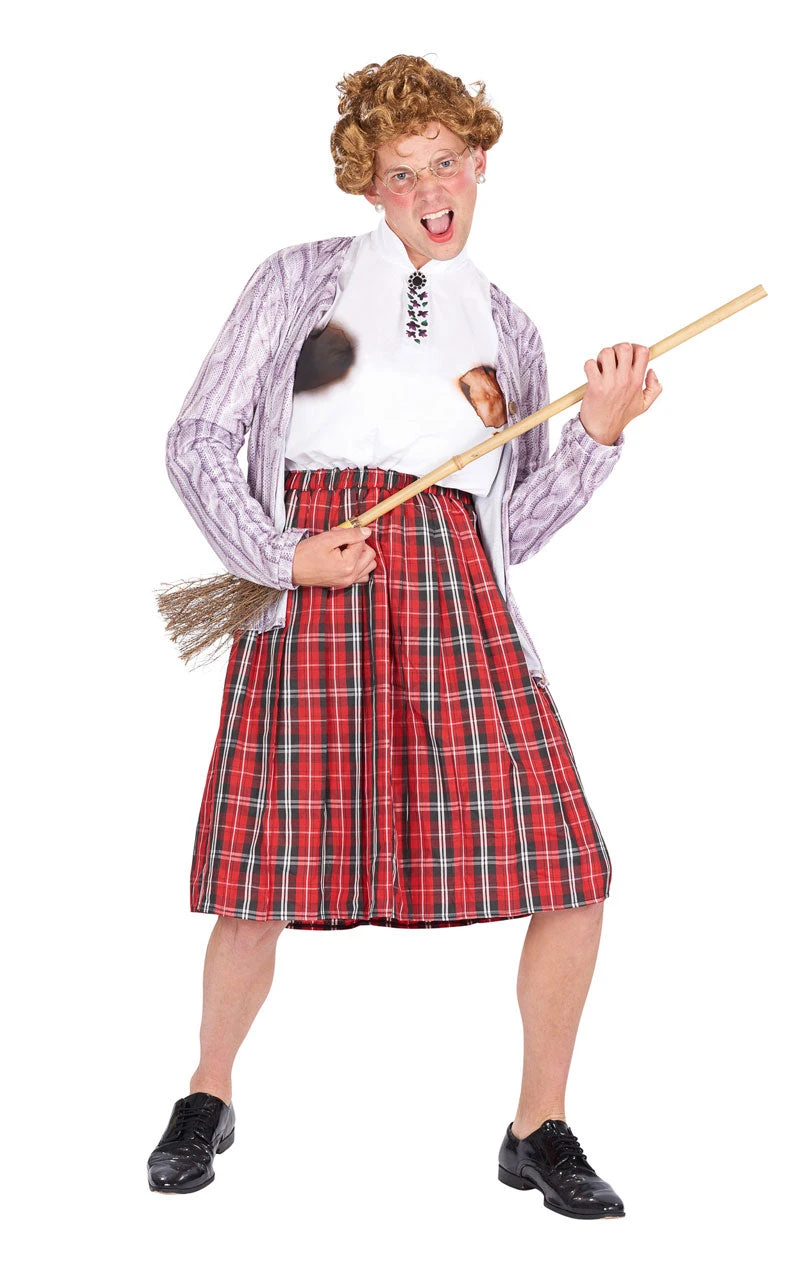 Our Mens Scottish Nanny Movie Costume comes with a dress with a white, high-neck shirt and padded boobs that are burnt from all that ‘cooking.’ The skirt of the dress is of a tartan pattern and comes up just below the knee. To finish off the look, and to make you look as ‘grannyesque’ as possible, it comes with a light purple cardigan. It envisions Robin Williams’ character perfectly and your friends will love you for it!