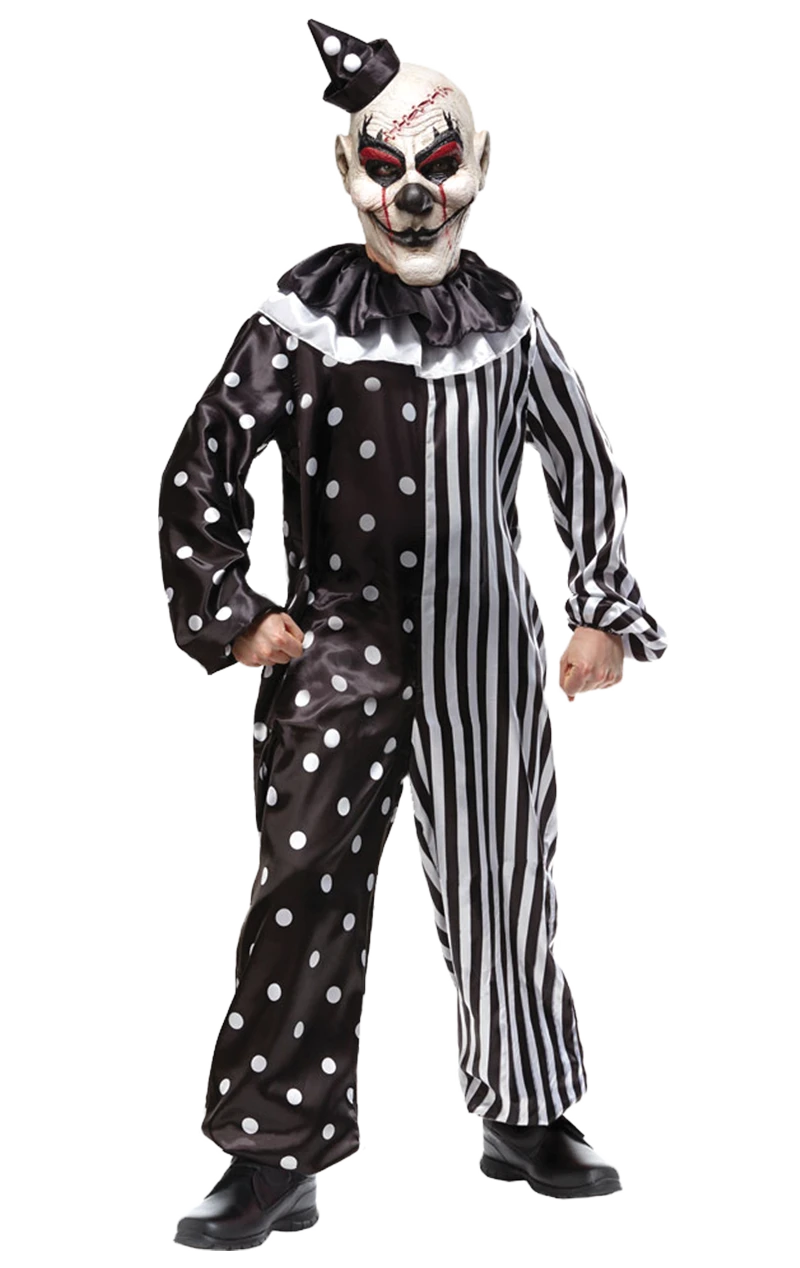 Our Kids Halloween Scary Clown Costume is made up of an all-in-one jumpsuit. The jumpsuit features a black and white stripe print on one side, and a spotted print on the other. The costume also has a matching collar that fits on over the head. To finish off the killer clown look, it includes a terrifying clown mask and attached hat, with features that will be enough to make anyone run a mile.