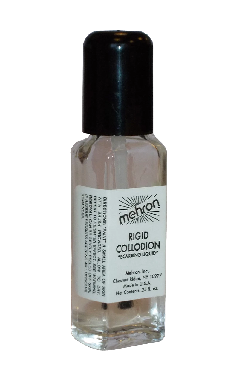 The Rigid Collodion & Brush has been a secret for make up artists to the stars for many years, creating realistic scars and scratches in big blockbuster films. Now you can bring a bit of movie magic to your costume too, simply apply liquid to a small area of the skin and repeat to heighten effect, application brush attached to cap for easy use. Use make-up to give appearance of swollen or inflamed skin and gently peel from skin to remove. Bottle .25 fl oz.