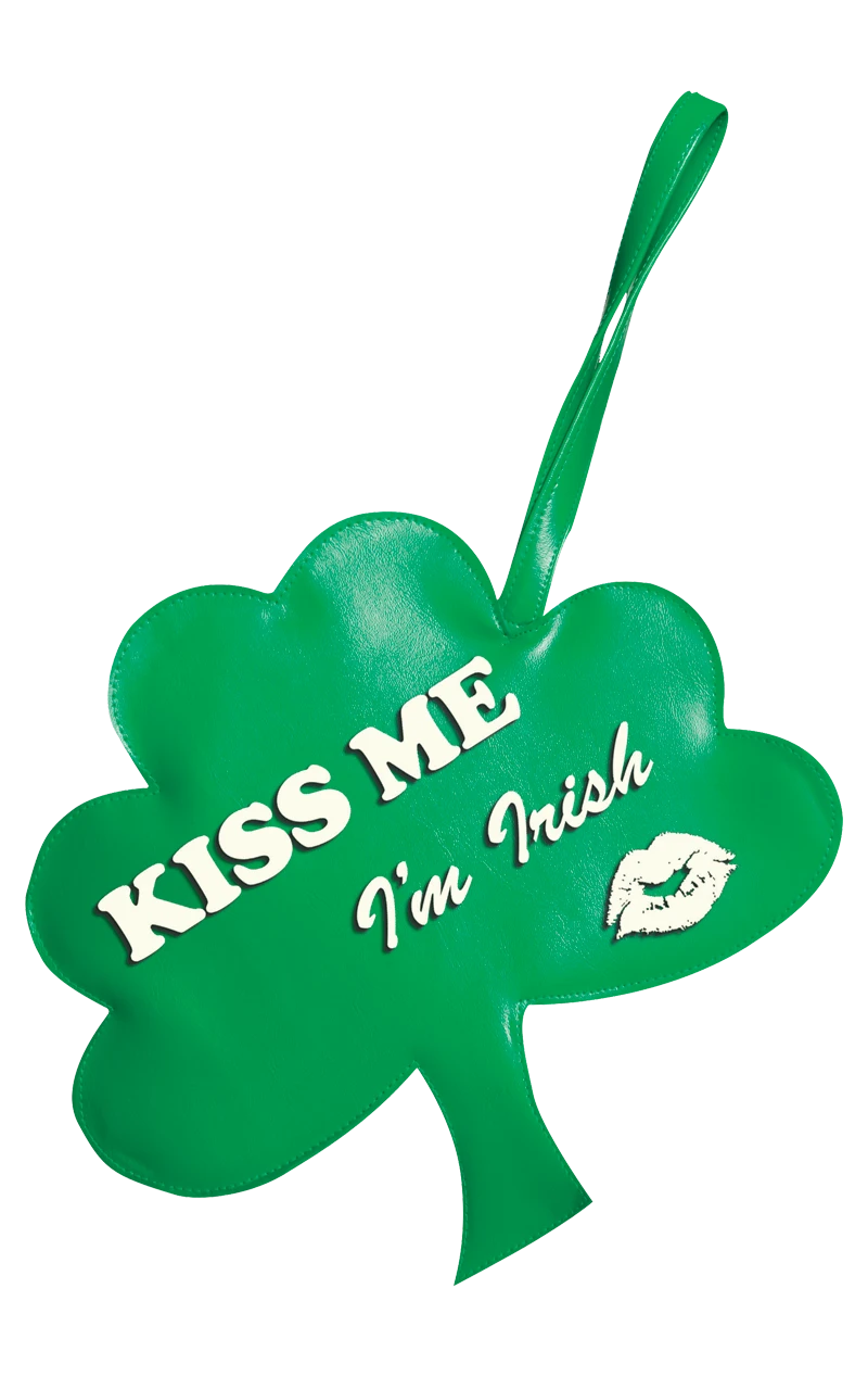 The shamrock faux leather wristlet is in the shape of a clover. With the words KISS ME I’M IRISH printed on it. It measures approximately 26cm at its widest point and has a zip closure at the back.