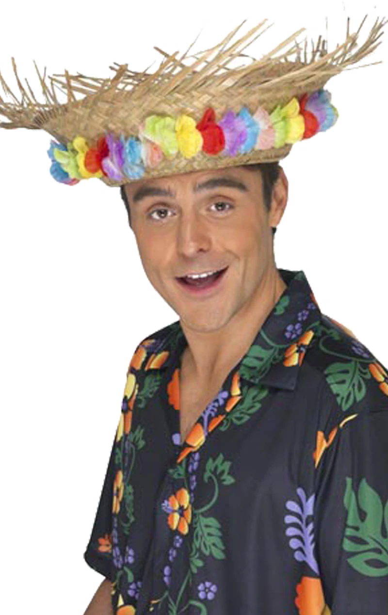 Aloah, this is the perfect hat for a Luau, woven out of straw the unfinished ends stick out all around the brim. The hat is finished off with leis style flowers.