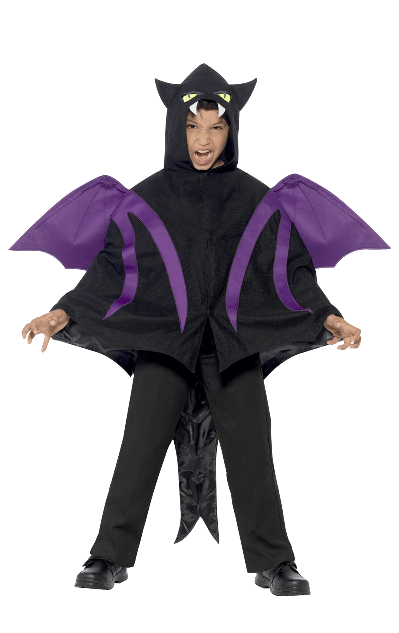 The Kids Hooded Bat Cape Costume includes a black hooded cape with attached purple bat wings. The face of the bat is printed on the front of the hood, with bright yellow eyes and fangs. The cape also has the long black tail attached to the back, completing the look for an outfit they’ll love.