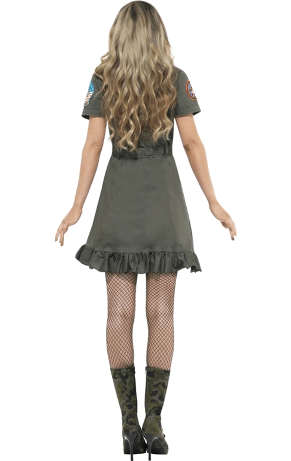 The Ladies Deluxe Top Gun Dress Costume is made up of a dark green dress with short sleeves, a collar, and multiple authentic looking badges on the chest and sleeves. The dress also has a zip down the front to give it that flight suit feel, but with a fun feminine twist. Completing the look is a pair of aviator-style sunglasses for the classic Top Gun finish.