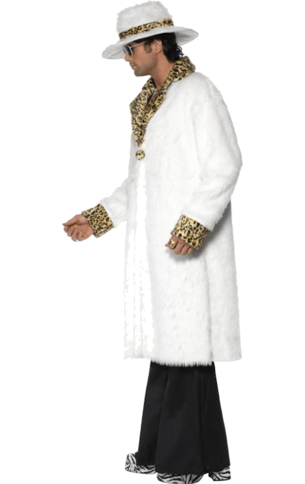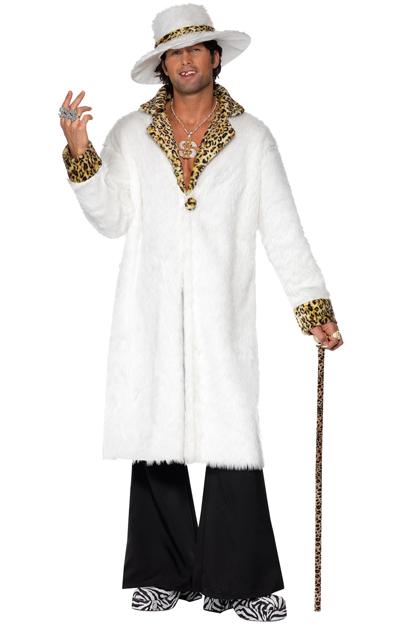 Pimp costumes don’t get more pimptastic than this Christmas snow themed furry white number, complete with leopard print trim, matching hat and even a pair of black flares! Feel those 70s vibes as you hang out in the nightclub with your honeys. Complete your look with a dollar sign necklace across your hairy chest and some gold signet rings!