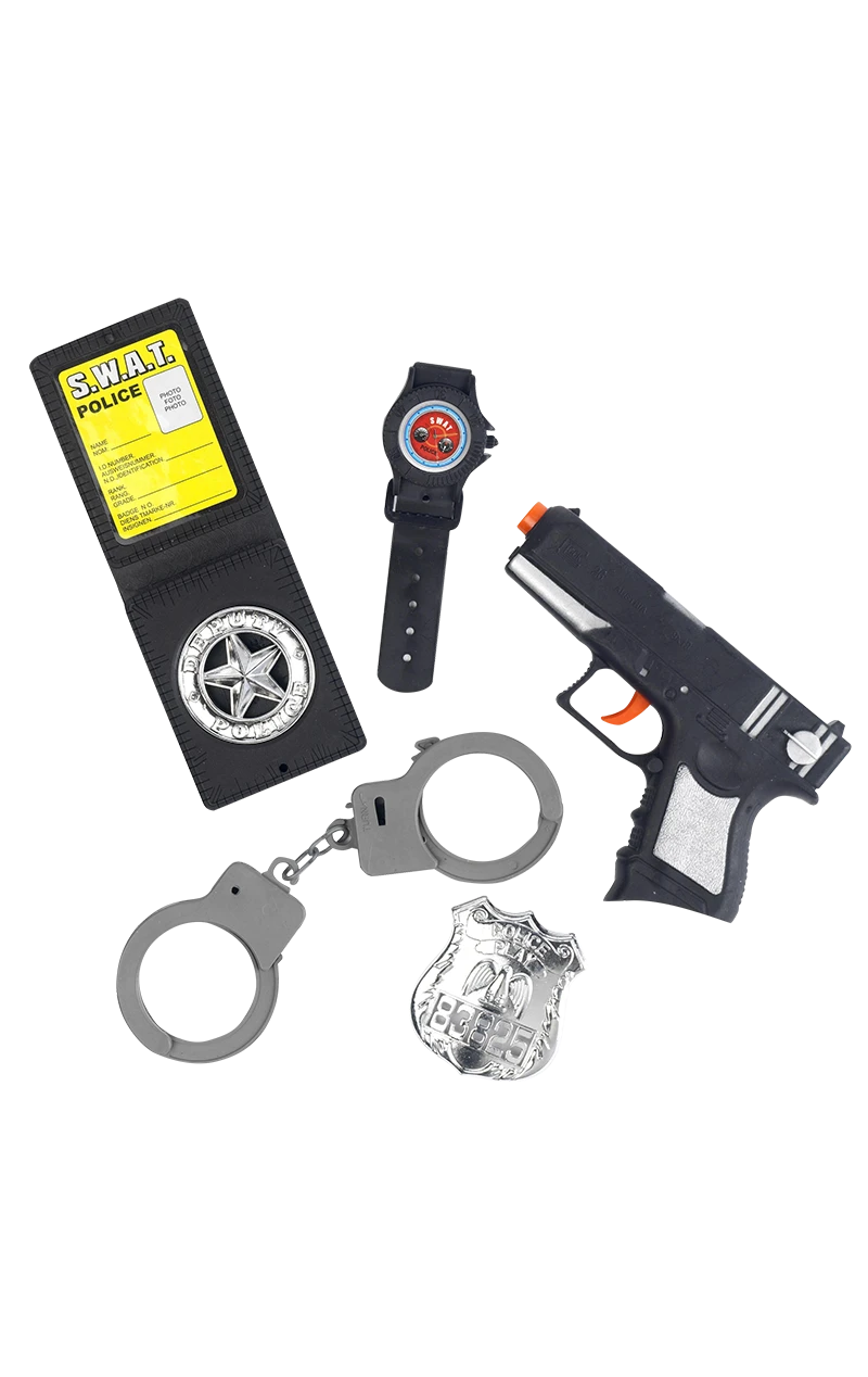 Want to ramp up your police uniform costume? Nothing will round off your outfit with this Police Accessory Set. Included in this set is a pair of handcuffs, a toy machine gun, police badges and a watch.