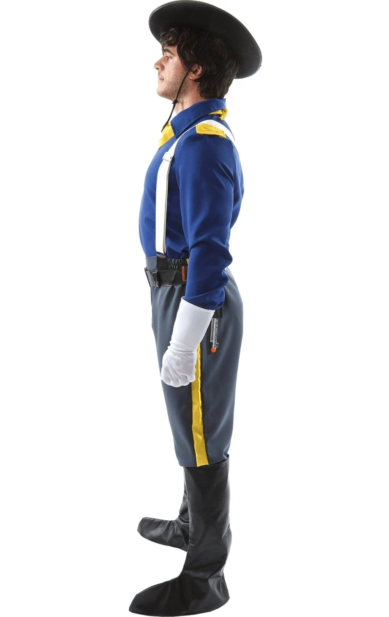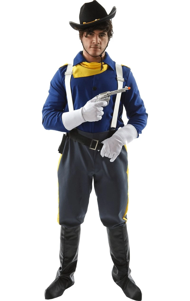 The US Cavalry Costume is made up of a royal blue shirt, navy trousers with yellow stripes down the side, and an attached pair of white braces. The costume also includes a yellow neck scarf, black belt, boot covers and a pair of white gauntlets. You’ll have everything you need to defend your nation and go on your next adventure exploring the US frontier.