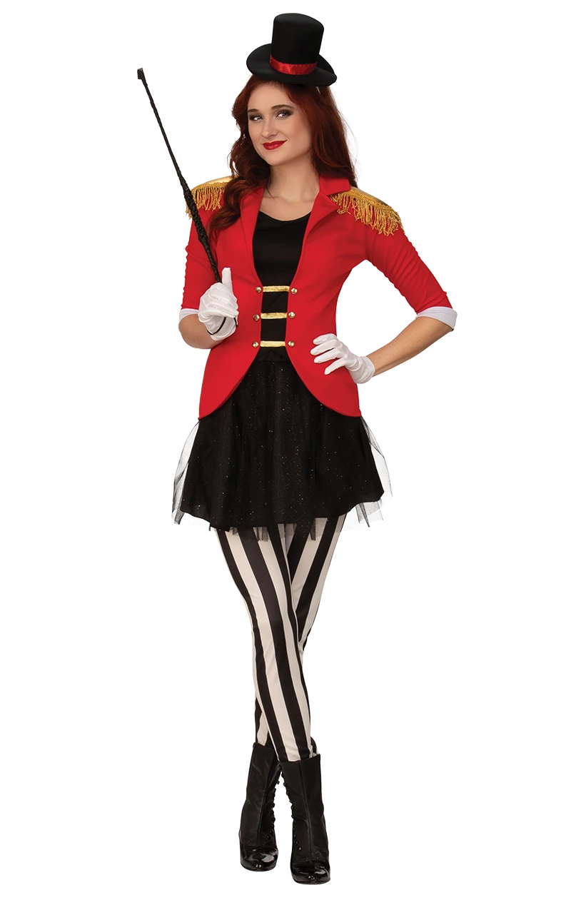 Strut your stuff as you lead the circus into the ring in this Womens Circus Ringmistress Costume. Featuring an iconic red jacket with gold-fringed epaulettes, a black skirt with netted overlay, black and white vertical striped tights and a mini top hat, this costume has everything you need to look the real deal at the party. Perform a spectacular show, the Greatest Show on Earth, in fact, whilst wearing this ringmaster costume for women. Add a whip and some gloves and you’re ready to dazzle them all, it’s perfect for Halloween and group costumes too!